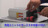 サーミスタのセンサ部分の青い部分をバッテリーに取付ます。これによりサーミスタ先端の温度検知を行いバッテリーの温度が上昇した場合など、温度エラーで充電を停止さっせます。